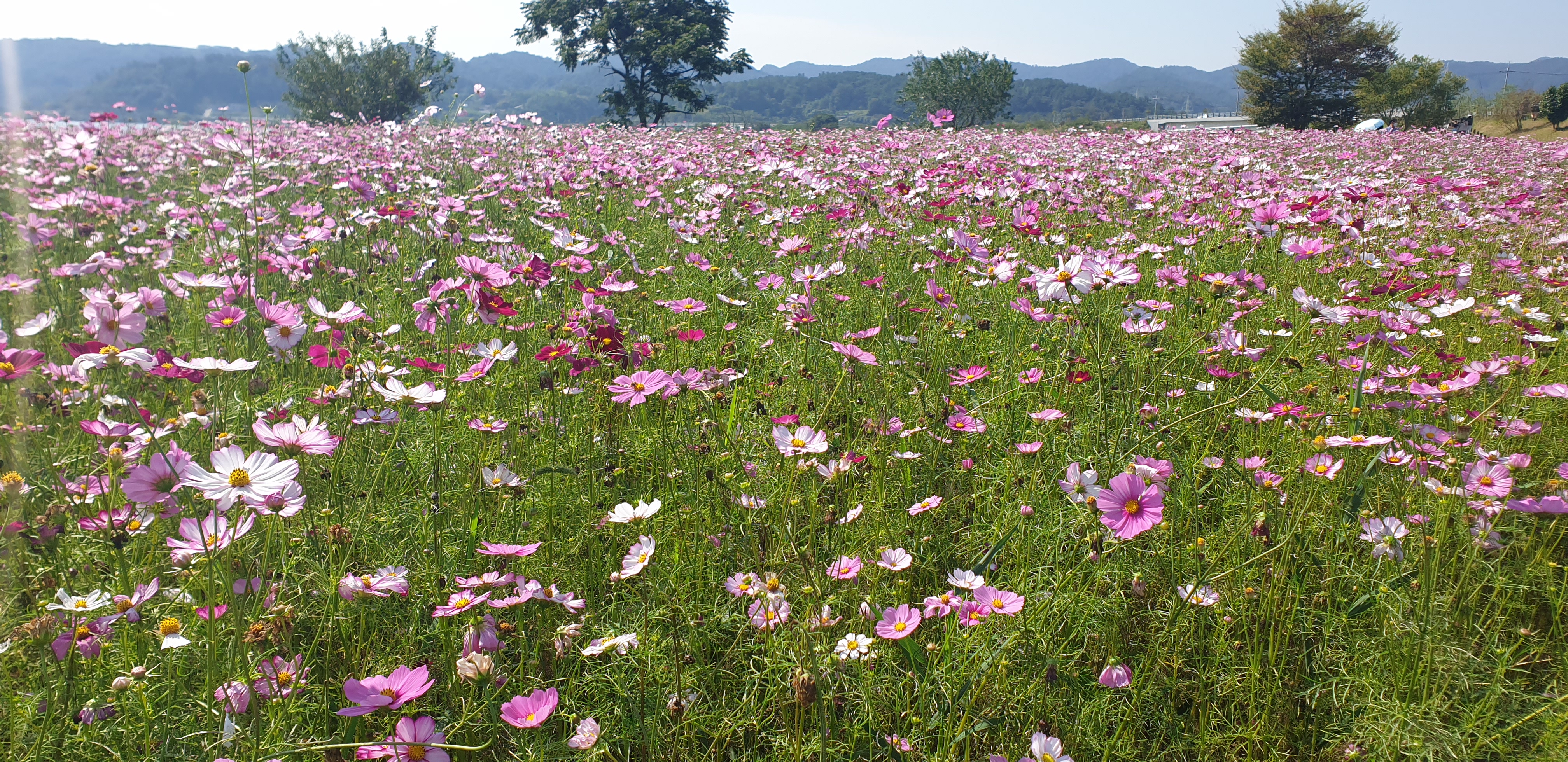 >코스모스 개천길로 넒게 펄처있는 코스모스
